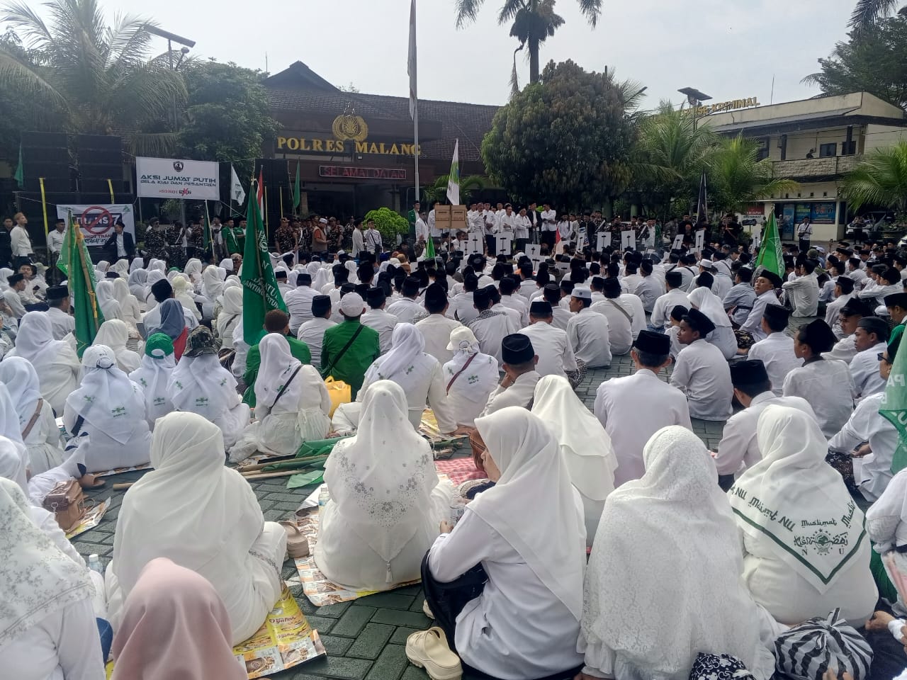 Jumat siang (17/10/2025) giliran ratusan santri bersama Kiai dan ulama di Kabupaten Malang menggelar aksi damai di Lapangan Mapolres Malang di Jalan Raya Ahmad Yani Nomer 1 Kepanjen, Kabupaten Malang.